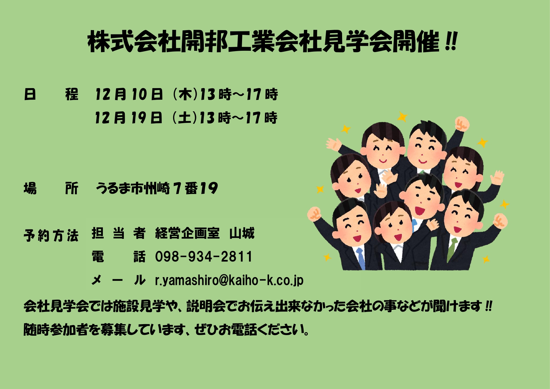 今月はの会社見学会は19日(土)にも予定しておりますので